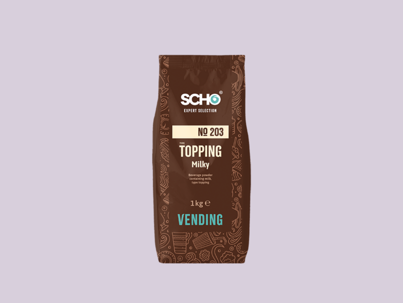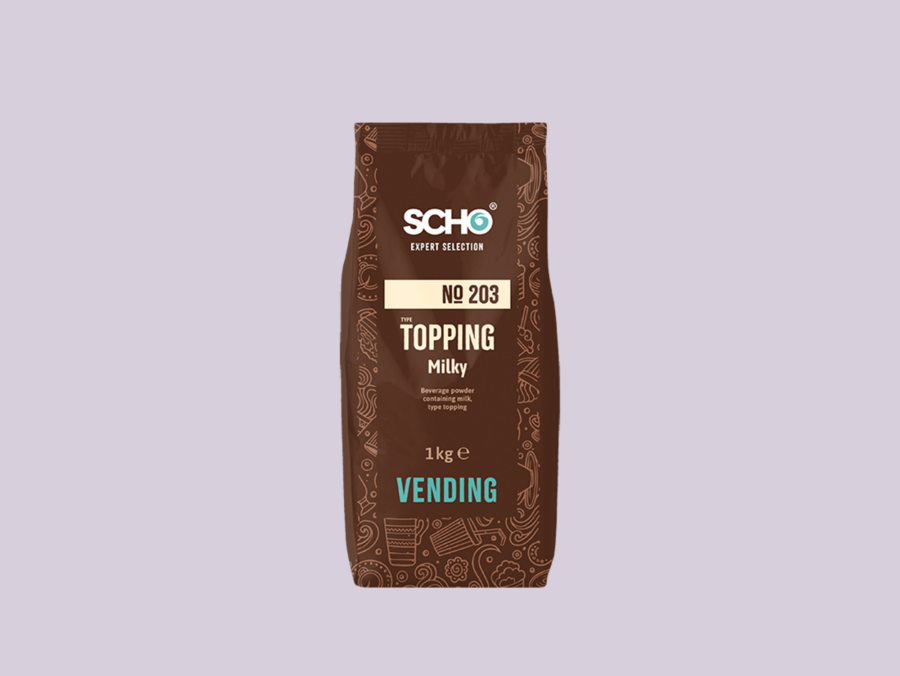 Topping no 203 Milky är en produkt avsedd för vendingmaskiner. Med sin naturliga mjölksmak kompletterar den choklad- och kaffedryck på ett fint sätt. Den är till exempel idealisk för att tillaga varm choklad, latte macchiato och cappuccino.